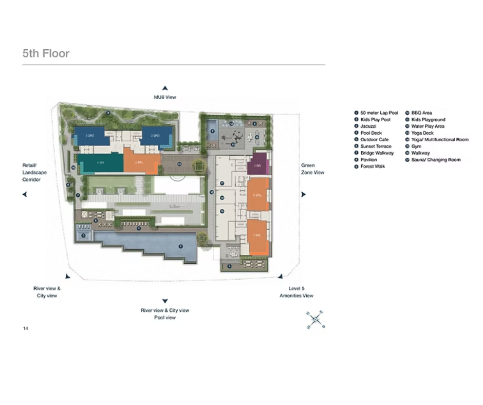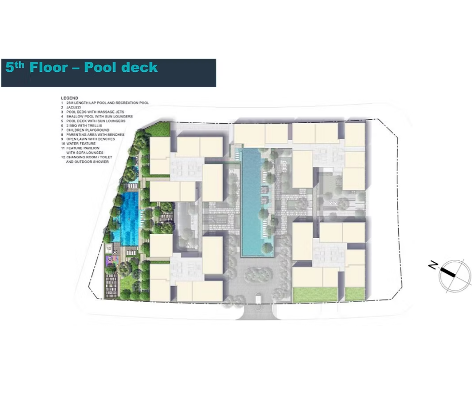Tầng 3: hồ bơi trẻ em, đường chạy bộ, khu BBQ, thác nước và khu vực thư giãn.